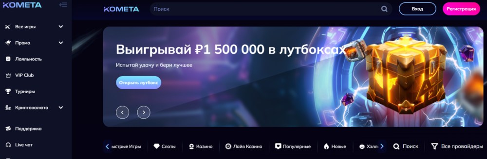 Комета казино официальный сайт выглядит стильно и лаконично. Его интерфейс переведен на английский, русский, казахский, узбекский языки, что увеличивает географию пользователей, которые могут зарегистрироваться на веб-портале. На главной странице представлены рекламные баннеры с информацией об актуальных турнирах и акционных предложениях.